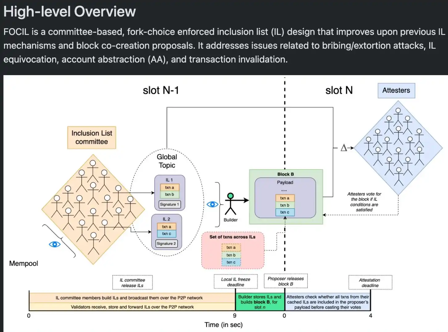 其中每个 slot 会从验证者集合中选出 Inclusion List Committee,委员会成员根据各自看到的 mempool,形成待纳入交易列表并进行广播;下一个 slot 的 proposer 需要构建一个满足这些列表约束的区块,而 attester 则只会为符合条件的区块投票。