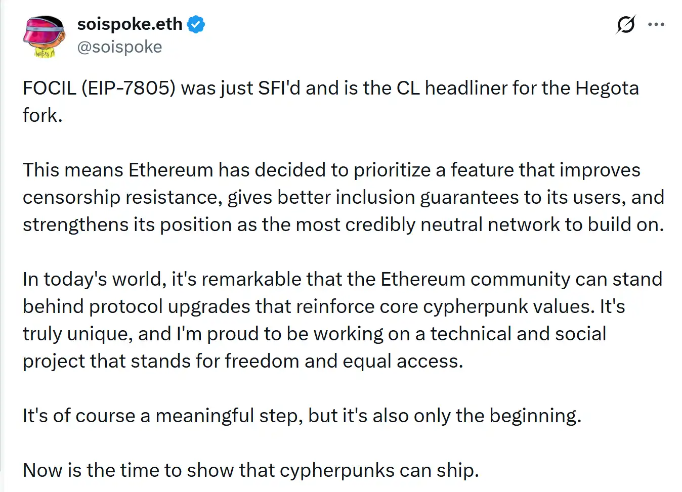 虽然备受争议,但 FOCIL 已被确认为下一次重大升级 Hegotá 的共识层核心提案(Specification Freeze Included 状态),预计在 Glamsterdam 升级之后、2026 年下半年上线。