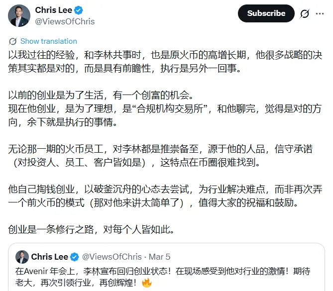 Original Huobi CFO Chris Lee The article states that Li Lin used to start businesses to make a living, seeing it as an opportunity to create wealth; now he starts businesses for his ideals, investing his own money and trying with a do-or-die mentality to solve the industry's difficulties, rather than replicating the old Huobi model.