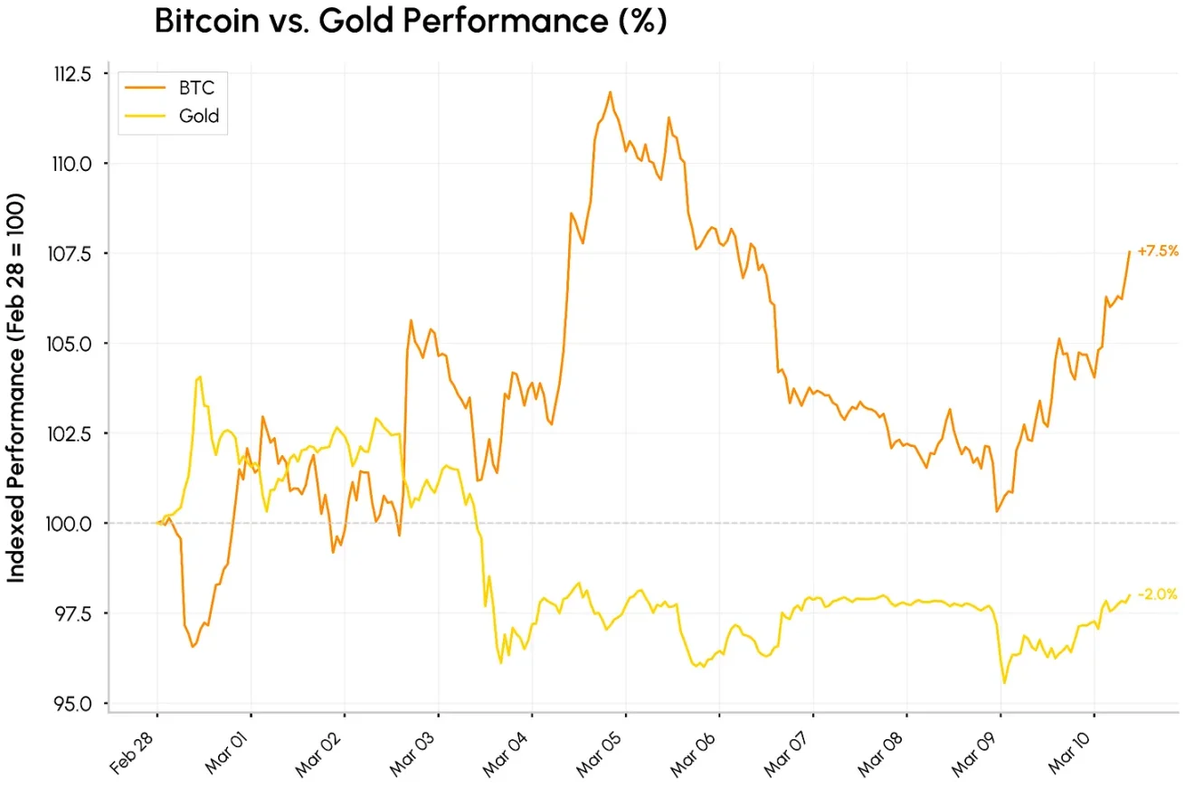 美伊冲突以来比特币和黄金的表现,数据来源:Coin Metrics