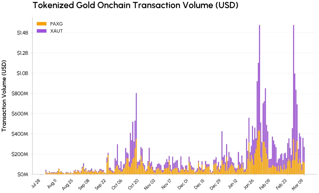 2 月初,各大中心化交易所的代币化黄金现货总交易量突破 18 亿美元;在伊朗、以色列与美国紧张局势升级时,交易量再次突破 10 亿美元。以太坊链上交易量也曾两次超过 14 亿美元,其中 Tether 发行的 XAUT 占据大部分活动量。