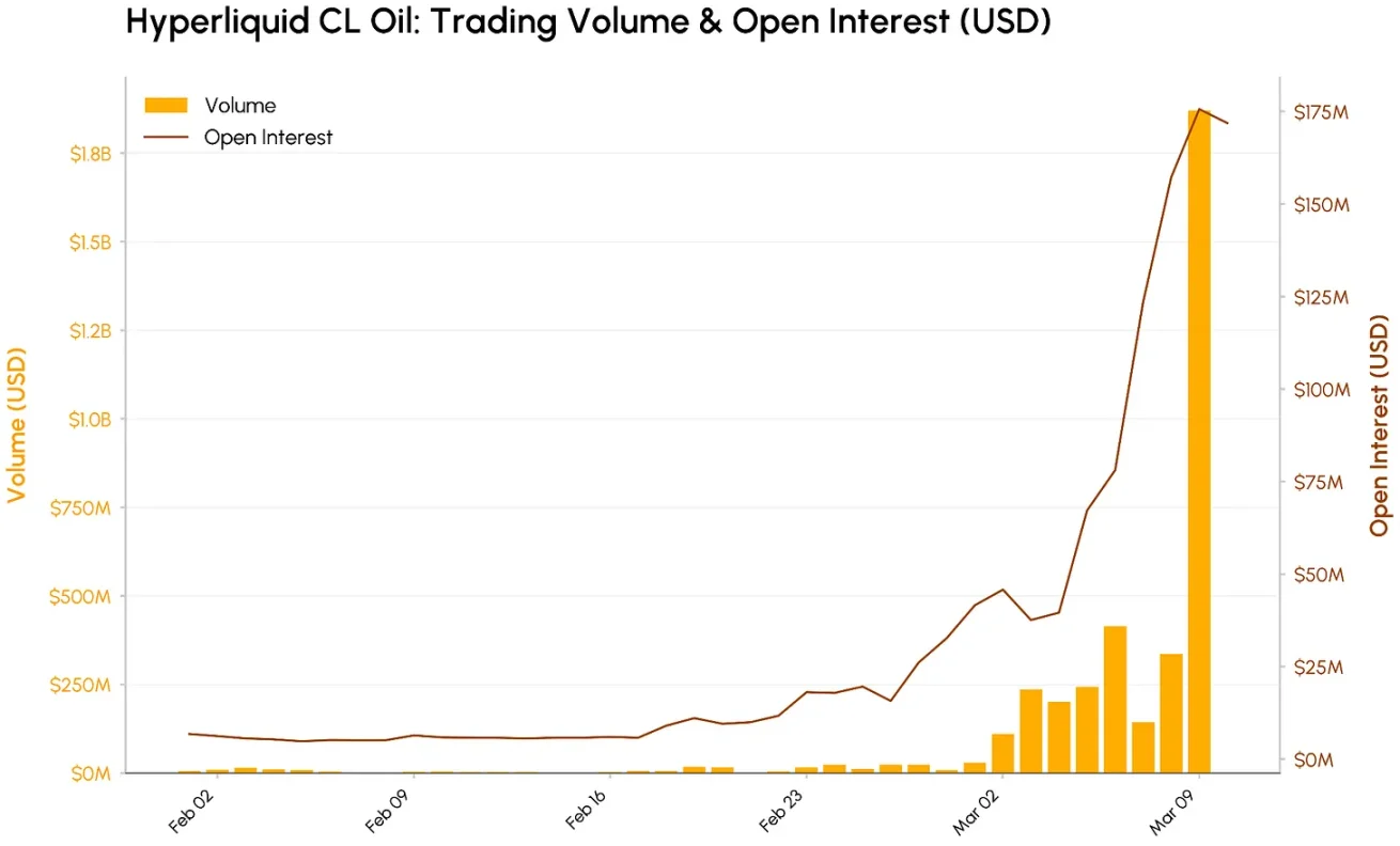 从 1 分钟 K 线图可以看到,周末期间 Hyperliquid 的 CL‑USDC 合约实时反映油价,一度飙升至 109 美元,直到传统市场重新开盘。同一时间段内,该市场的持仓量和交易量分别攀升至约 1.75 亿美元和 19 亿美元,成为平台上交易量第二大的市场,超过以太坊永续合约。交易者用它来表达对供应冲击的判断。