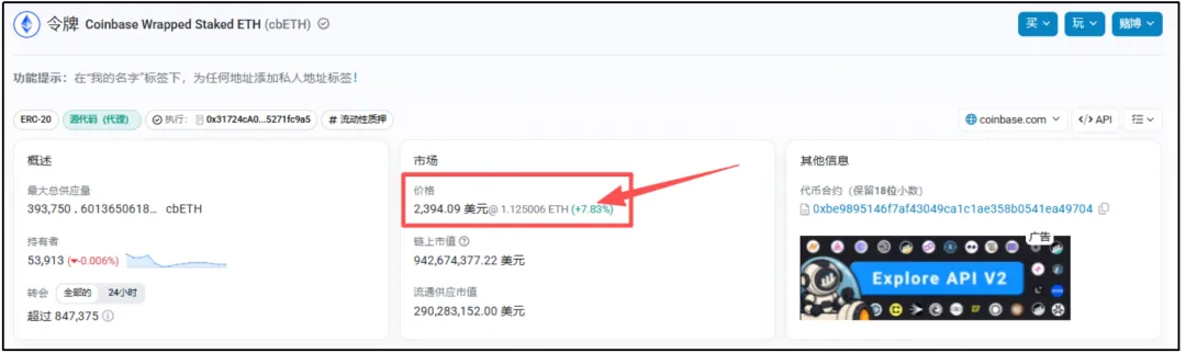 举例来说:假设1cbETH≈1.12ETH,且1ETH≈2200美元,那么1cbETH的真实价值应为2464美元。
