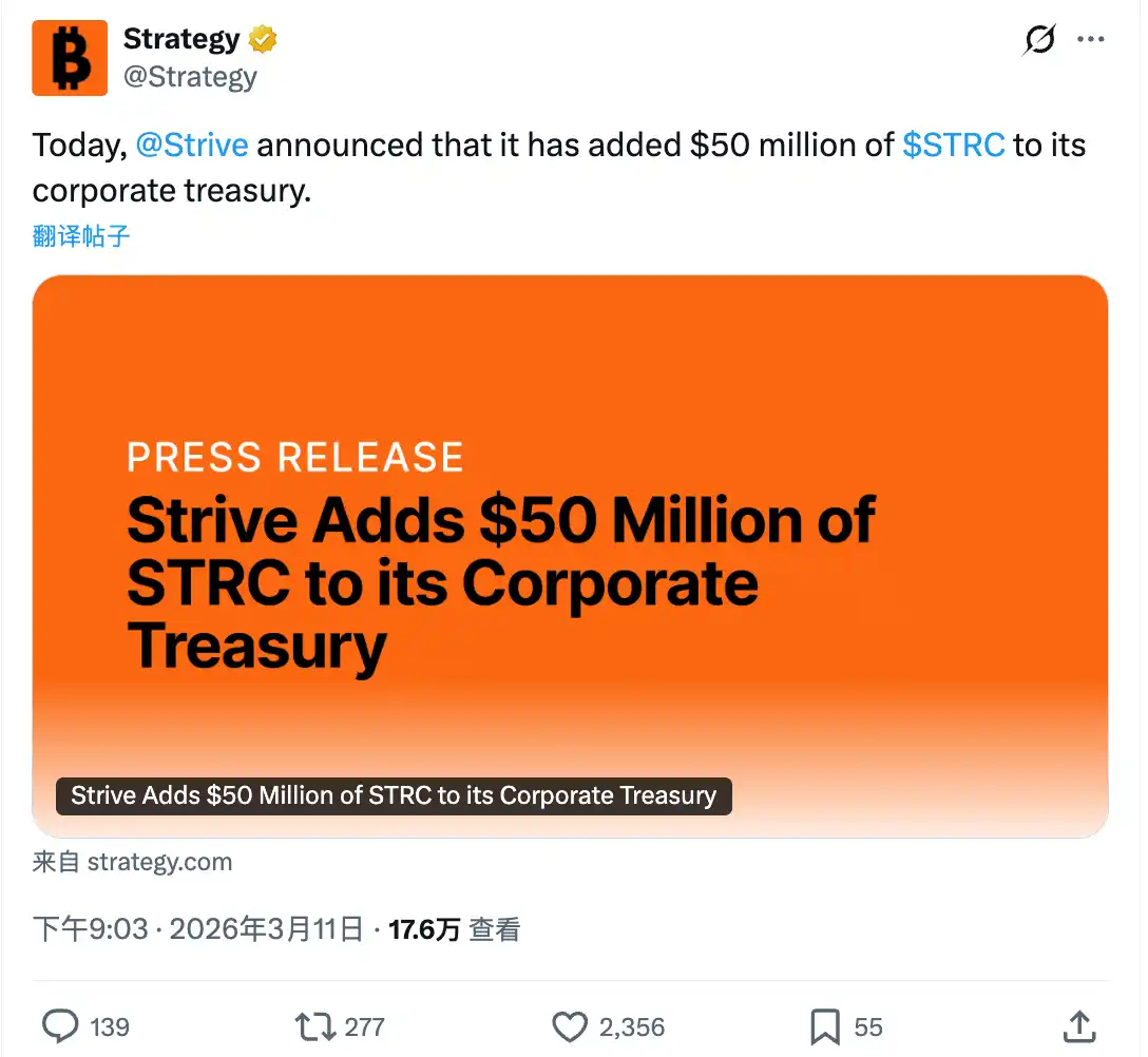但 3 月 11 日这笔交易,把两条线接上了。Strive 拿 5000 万美元买了 STRC。