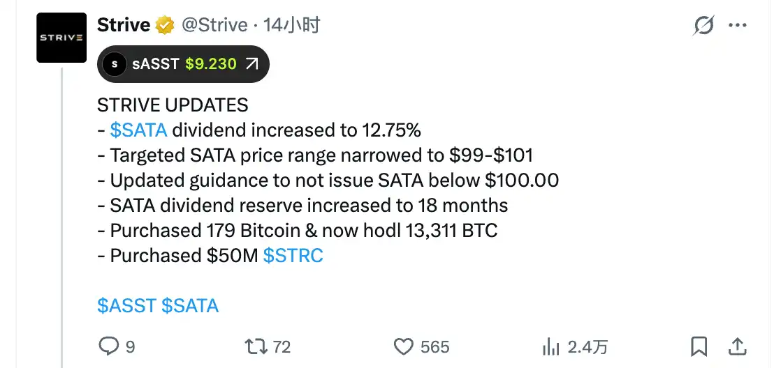 增持 179 枚比特币,总持仓 13,311 枚,价值大约 9.3 亿美元。自家优先股 SATA 的股息率上调到 12.75%。以及,花 5000 万美元买了 Strategy 的优先股 STRC。