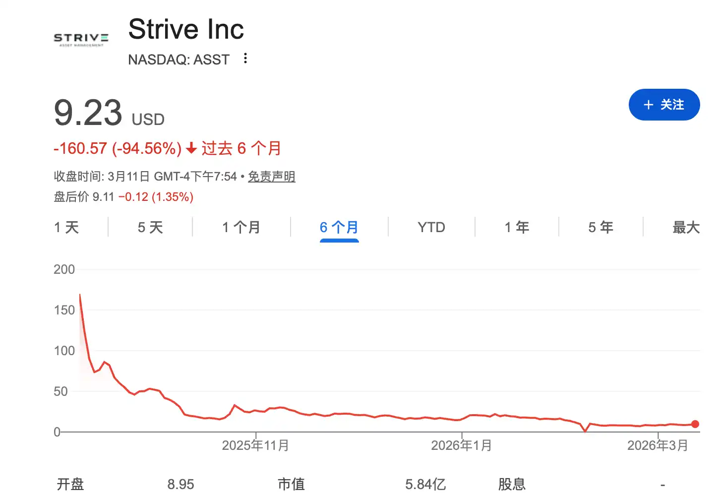 而 Strive 自己的股票 ASST,最近 52 周最高点是 268 美元,现在不到 9 美元,跌了 97%。在宣布买 STRC 当天(3 月 11 日),股价也只上涨了 5.52%。