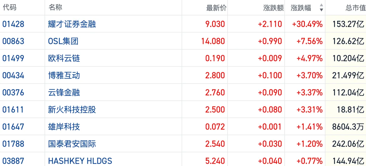截至发稿,耀才证券金融(01428.HK)叠加蚂蚁集团收购要约延长利好涨超30%,OSL集团(00863.HK)涨约7%,云锋金融(00376.HK)等多只个股跟涨3%以上。