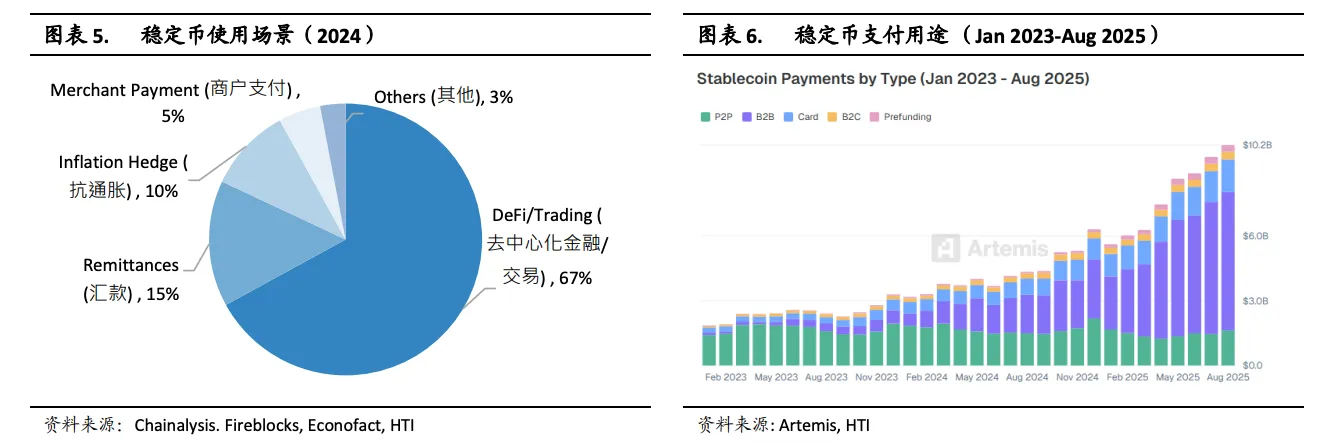数据显示,2023年初至2025年8月,稳定币支付累计规模已达1360亿美元,年化增长速度约为传统支付体系的10倍,其中近三分之二来自B2B支付。