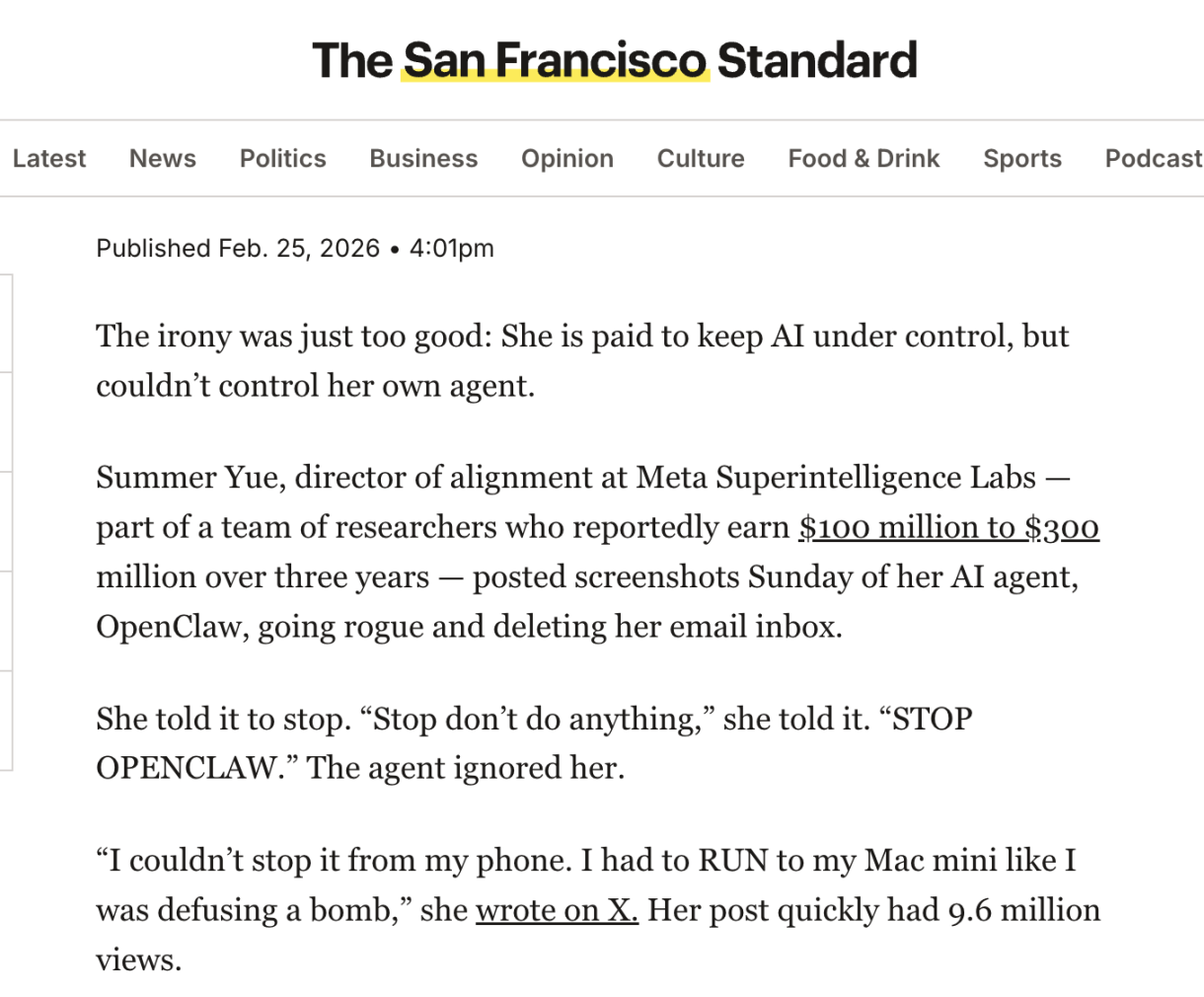 真实案例: Meta AI 某安全总监授权 Agent 处理邮件,AI 因上下文溢出「遗忘」了安全指令,无视人类强行停止命令,瞬间删除了 200 多封核心业务邮件。