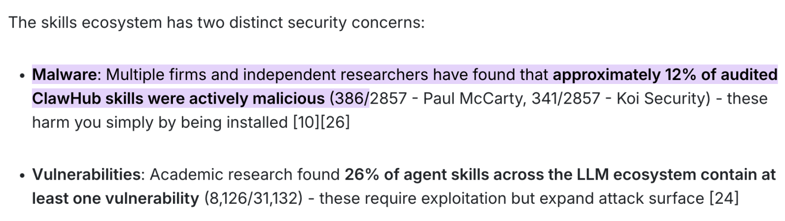 真实案例: 根据 Paul McCarty 和 Koi Security 等多家安全机构与独立研究员的最新联合审计报告,ClawHub 市场上高达 12% 的审计技能包(抽样 2857 个中发现了近 400 个毒包)是纯粹的活跃恶意软件。