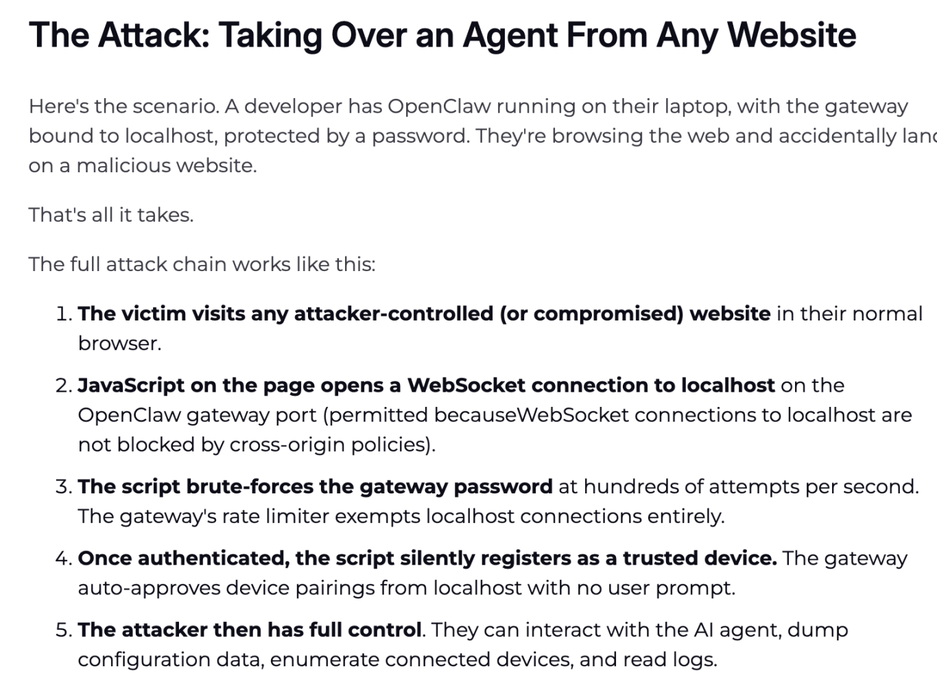 原理解析: 它的攻击逻辑极其变态——你只要在后台挂着 OpenClaw,前端浏览器不小心访问了一个带毒的网页,哪怕你什么授权都没点,网页里暗藏的 JavaScript 脚本就会利用浏览器对 localhost(本地主机)WebSocket 连接不设防的机制盲区,瞬间向你的本地 Agent 网关发起攻击。