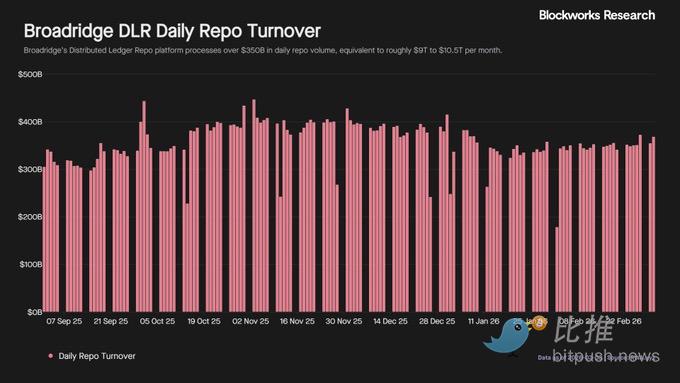 DTCC 和 Broadridge 代表了资产和资金层。DTCC 将受监管的抵押品带入链上,而 Broadridge 已经促进了大规模的回购融资活动。代币化一项资产是一次性行为,真正的潜力在于这些国债在交易对手之间被反复融资、质押和再利用。