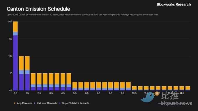 发行模式: CC 遵循纯粹的earn model。没有预先分配给投资者、团队或基金会。所有代币均通过网络参与铸造。前 10 年共可铸造 1000 亿 CC,之后每年固定排放 25 亿。