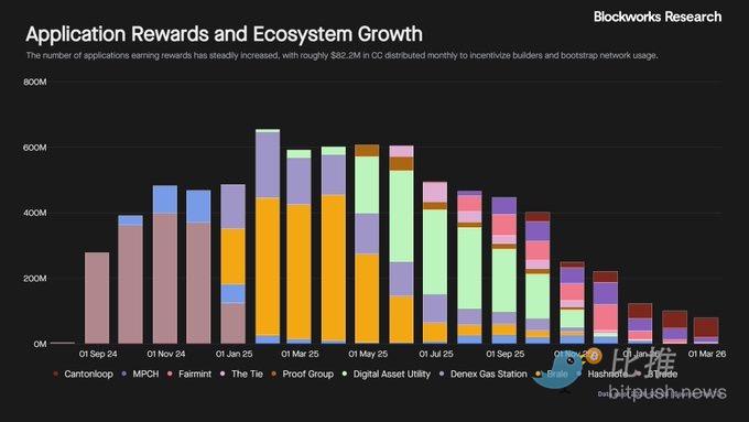 从奖励份额排名前 10 的应用来看,活跃赚取者的数量稳步扩大,表明生态系统日益健康。按当前价格计算,每月约有 8220 万美元的 CC 分发给应用。这为构建者创造了巨大的经济激励,他们也可以将奖励转给终端用户以引导流动性和使用量。