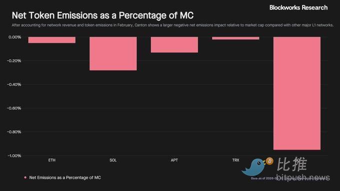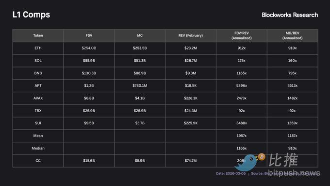 估值相对于同行仍有折价。 Canton 在 2 月份产生的收入(REV)在主要 L1 网络中排名最高,但其交易倍数较低,这可能反映了近期通胀的影响,以及市场更多将其视为金融基础设施而非通用型公链。