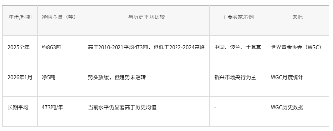 黄金价格的上涨首先源于中央银行对美元资产的持续减持与对黄金的增持。过去几年,全球央行净购金规模保持高位。2025年全年央行净购金量约为863吨,虽较前几年高峰有所回落(2022-2024年连续超过1000吨),但仍远高于2010-2021年平均473吨的水平。进入2026年,1月份净购金仅5吨,显示短期势头放缓,但整体趋势未逆转。波兰、中国、土耳其、印度等新兴市场央行仍是主要买家,部分国家如马来西亚和韩国在2026年初重启或扩大黄金配置。