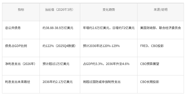表1:美国国家债务与利息支出关键数据(2026年3月最新估算)