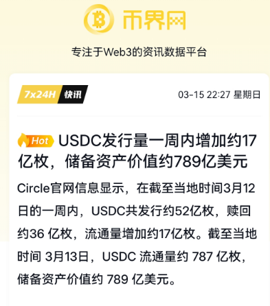 根据币界网的报道,Circle官网数据显示,截至当地时间3月12日的一周内,USDC的总供应量发生了显著变化。在这段时间内,USDC的发行量达到了约52亿枚,同时赎回量约为36亿枚,最终净增发行量为17亿枚。