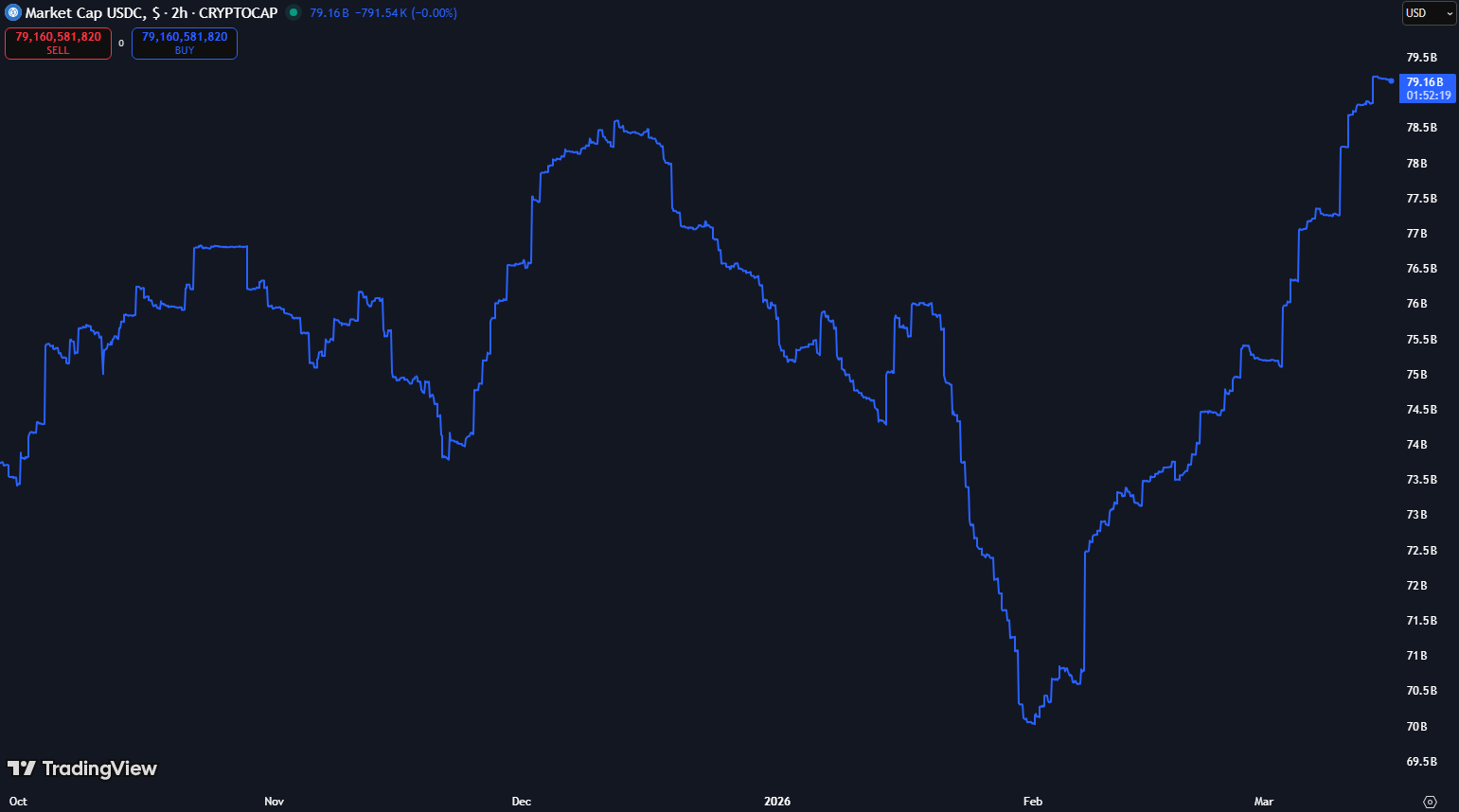 不仅如此,今日3月16日的数据显示,自3月9日以来,USDC的市值出现了很明显的增长。在过去的一整周里,USDC的市值从772.4亿美元攀升至791.6亿美元,增幅近20亿美元。这一情况也意味着,全球投资者正在积极将自己的法币货币兑换为USDC,显示出全球市场对USDC的需求正在加剧。