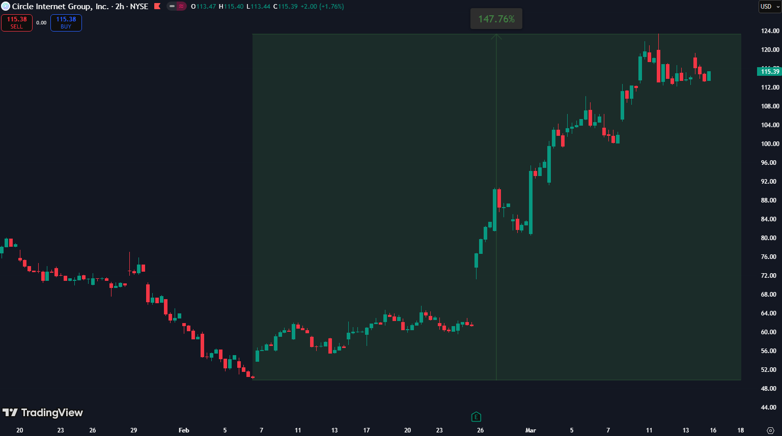 与此同时,USDC发行公司Circle(CRCL)的股票表现也令人瞩目。在短短一个半月的时间里,Circle的股票价格就实现了超过一倍的增长,从回落的最低点价格50美元(这一价格甚至跌破了其最初的发行价69美元)一路上涨至当前的123.4美元,最大涨幅接近150%。