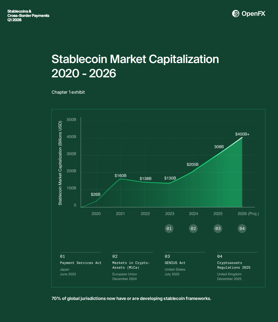 本报告由 OpenFX 发布,Q1 2026。OpenFX 是下一代跨境支付的可信结算层,提供机构级稳定币基础设施与本地支付轨道的整合,作为传统代理行银行的更快、更高资本效率的替代方案。