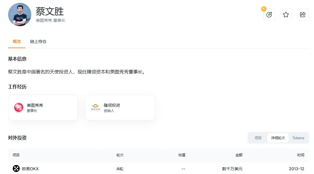 据 RootData 显示,蔡文胜旗下隆领资本早年曾投资了加密交易所 OKX(原 OKCoin)。2018 年,他对外透露已投资 10 余个区块链项目,包括 Theta、Ontology、Zipper 等。