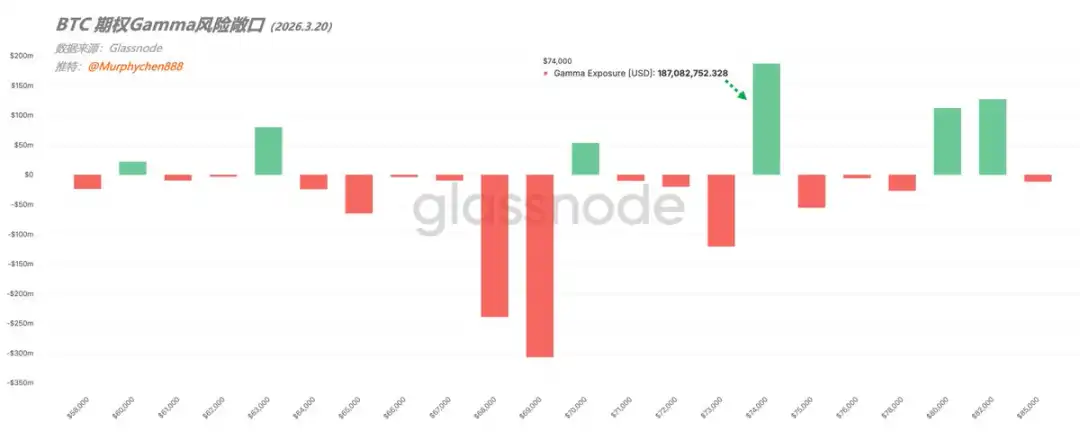第三,期权结构正在为 75,000 美元制造磁吸效应。加密分析师 Murphy 指出,3 月 20 日到期的期权在 74,000 美元附近存在约 1.8 亿美元的 Long Gamma 敞口,做市商的对冲行为会抑制波动,使价格倾向于在该区间震荡,客观上形成阻力。