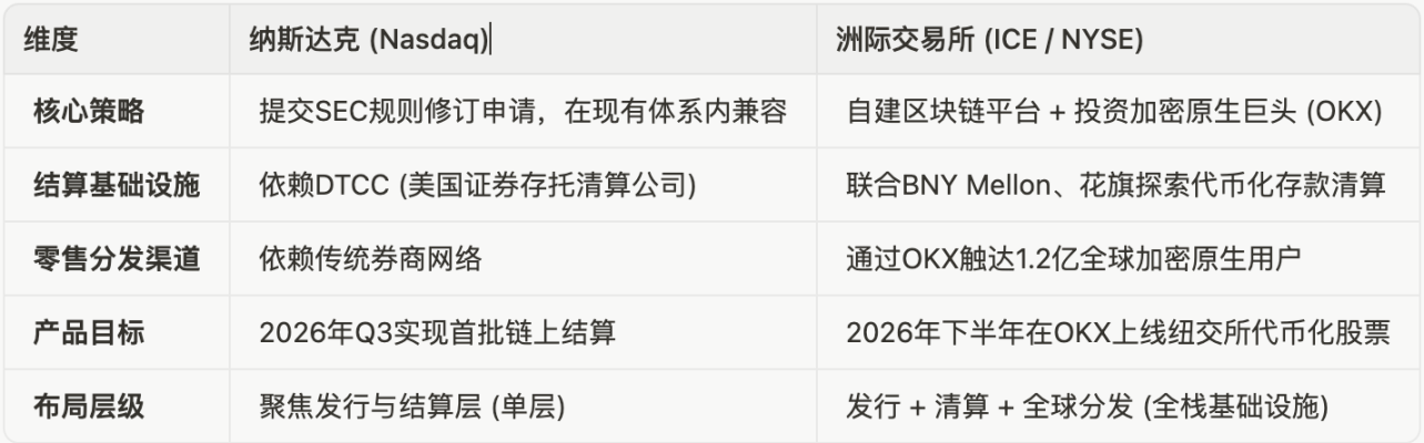 在资产代币化的基建推演中,市场分化出两条截然不同的演进路线。纳斯达克倾向于改良主义,依托 DTCC(美国存管信托与清算公司)等传统清算中心,在现有合规体系内完成代币化资产的登记与流转。相比之下,ICE 的战略布局呈现出明确的垂直整合特征,试图重构从资产封装到终端分发的全链路闭环: