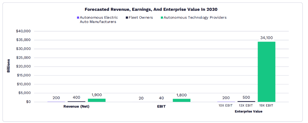In terms of autonomous driving, the cost per mile can be reduced to $0.25 after scaling up, far lower than that of human-driven ride-hailing vehicles and private cars.The technology is ready, the market size is $34 trillion, and the value will mainly belong to platform operators who master the core technologies. The US and China will be the first to implement this technology.