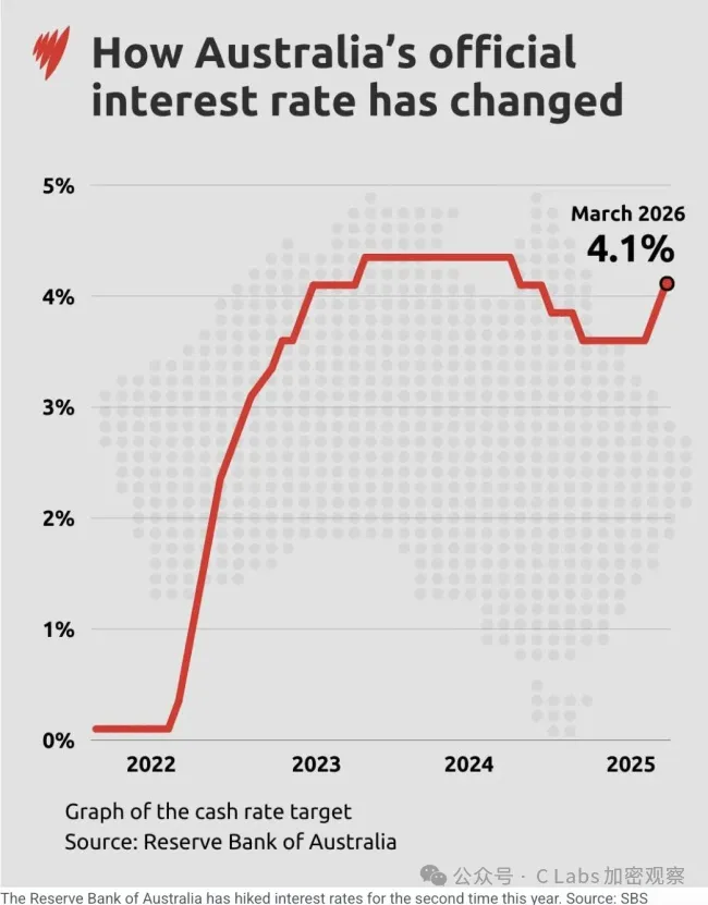 而且澳洲四大行预测,澳洲五月份很可能会再加25bp,利率升至4.35%,届时将完全抹去2025年三次降息的全部成果。