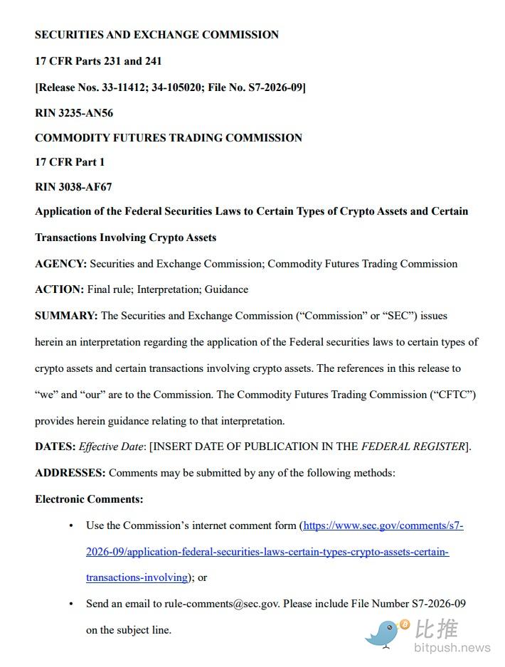 March 17, 2026, United StatesSecuritiesTrade Commission (SEC) and Commodity Futures Trading Commission (CFTC() jointly released document number 33-11412Explanatory documentsA 68-page documentRegulationThe framework officially declares that the United States' crypto regulation has bid farewell to a decade-long era of "law enforcement instead of regulation" and entered a new era of clarity and harmony driven by "Project Crypto".