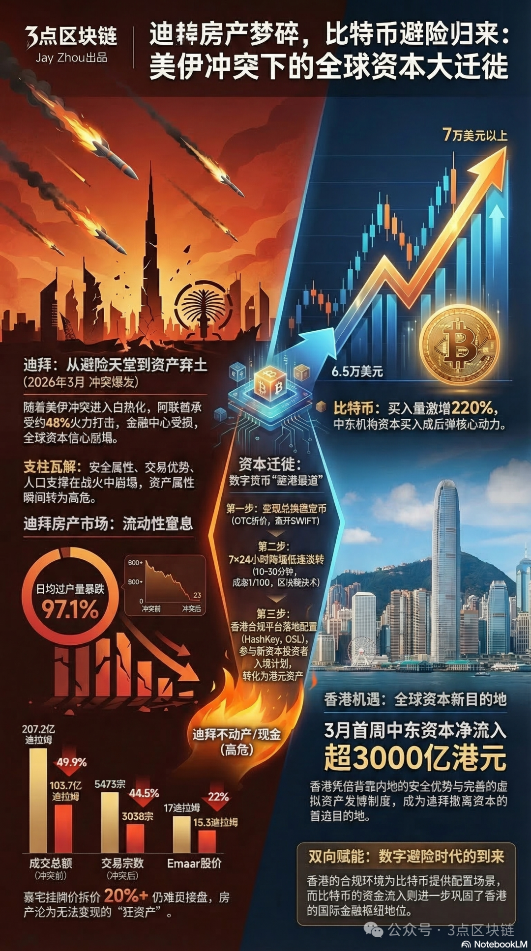 本文将结合最新战报、市场数据与行业案例,拆解美伊冲突下迪拜局势的恶化脉络,复盘迪拜房产从神话到破灭的全链条崩塌,还原资本通过数字货币向香港迁徙的真实路径,最终揭示此轮比特币反弹的核心逻辑与未来趋势。