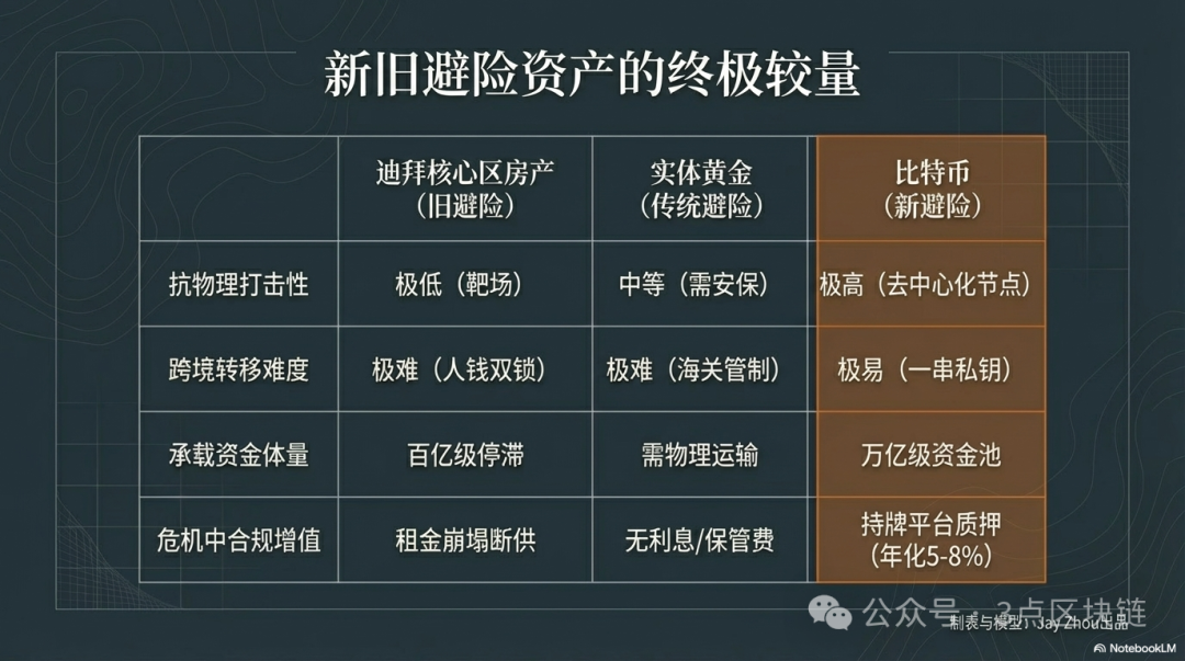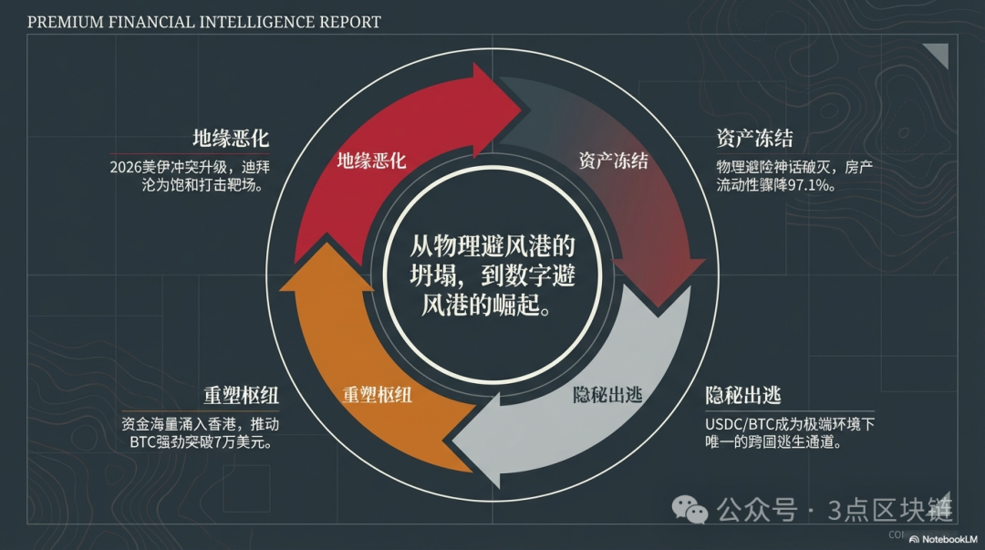 2026年美伊冲突引发的迪拜局势恶化,不仅击碎了迪拜的“安全神话”与“房产神话”,更重塑了全球资产配置的逻辑——在极端地缘风险面前,传统的不动产避险资产不再可靠,去中心化、高流动性、合规化的数字资产,以及安全、合规的全球金融枢纽,成为全球资本的首选避险选项。