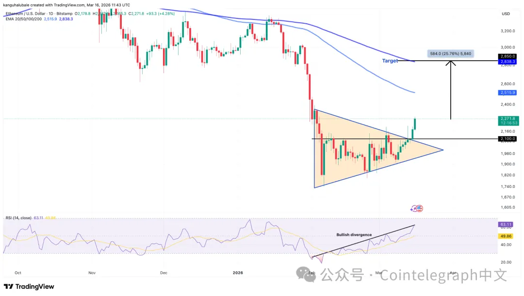 ETH本轮突破上沿趋势线后的目标测算在2850美元,较当前价位高出26%。该水平与图中紫色线所示的200日EMA相吻合。