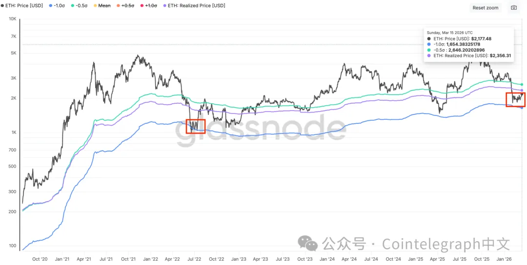 ETH始终在由2350美元实现价格上限与1650美元MVRV最低区间形成的宽幅区间内震荡。