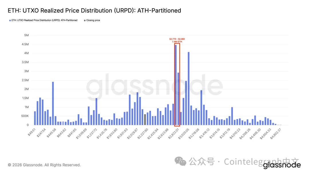 Glassnode的经实体调整的UTXO实现价格分布(URPD)显示,当前ETH UTXO在2770-2880美元形成了大量供应,是长期持有者逐步累积的区间。投资者在此买入了超790万枚以太坊。