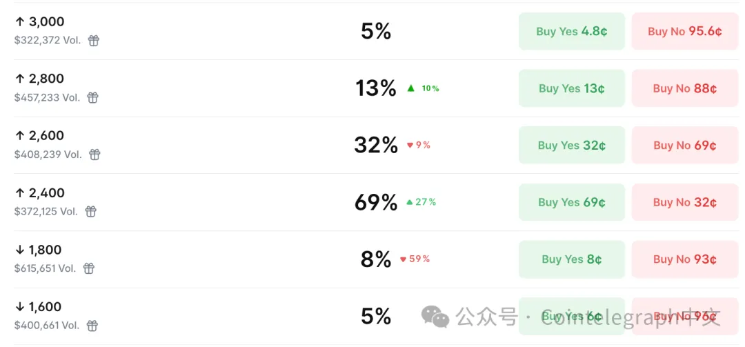 交易者目前给予ETH在三月触及2800美元概率为13%,较过去24小时上升10个百分点。2600美元和2400美元目标位的看涨信心更强,分别为32%和69%。