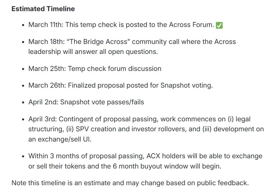 3月11日,Across Protocol DAO 提出了具争议性的提案,建议通过代币换股收购,转型为一家私人公司。负责Across(ACX)开发的 Risk Labs 团队表示,代币及DAO架构“实质性”影响了其与企业和机构达成交易的能力。