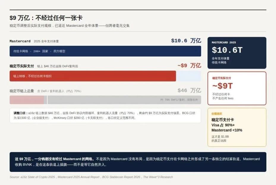 数字说明了差距有多大:稳定币过去 12 个月链上转移总量 $46 万亿,调整后实际支付规模约 $9 万亿,已接近 Mastercard 2025 年全年支付体量 $10.6 万亿——而这 $9 万亿,不经过任何一张卡。在稳定币支付卡这个最直接的消费场景里,Visa 占了 90% 以上的交易量。Mastercard 输掉了先手,$1.8B 是补回来的成本。