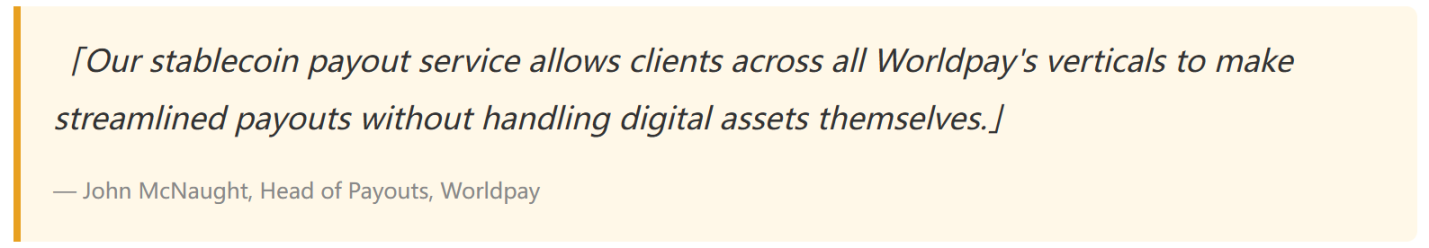 具体是什么意思?Worldpay 想让全球 180 个市场的承包商收到稳定币,但 Worldpay 的团队不懂区块链、不想持有加密资产,也没有跨 130 个国家的合规牌照。BVNK 把这三层封装进一个 API——Worldpay 账上的美元进去,目标钱包的稳定币出来,目标地址也可以自动换成当地法币。Worldpay 的系统全程未「碰到」任何链上资产。这是基础设施生意,不是产品生意。