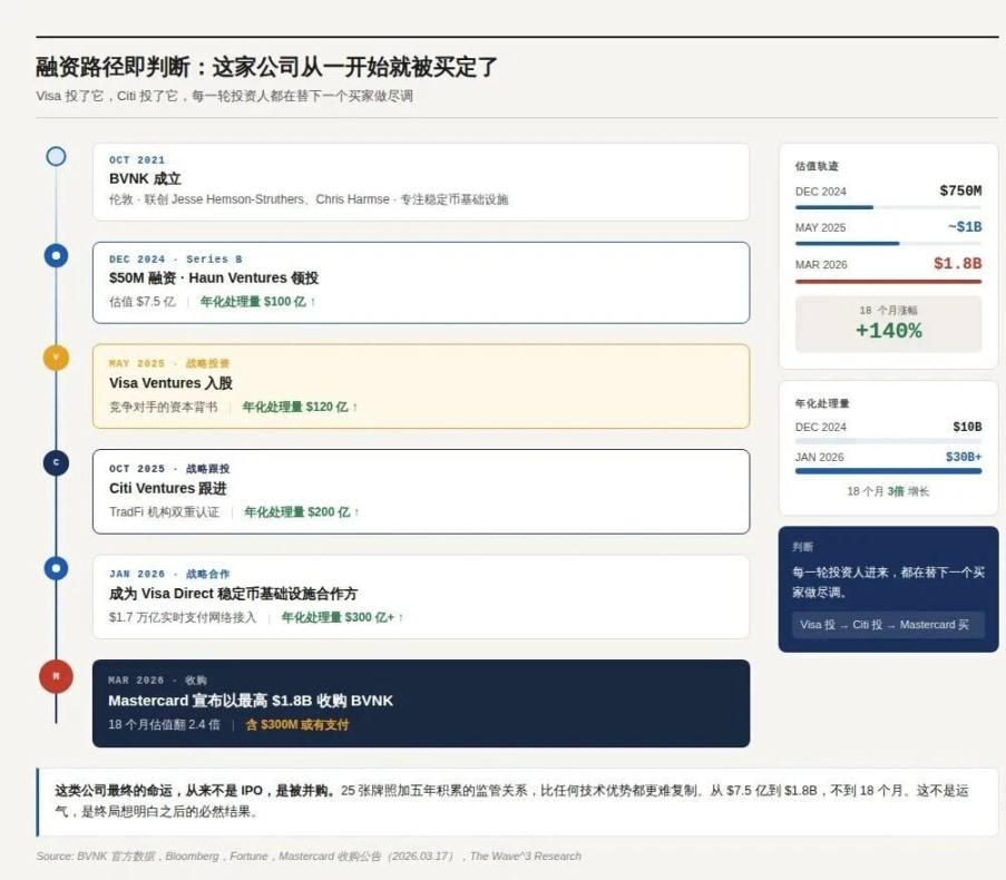 融资路径本身是一个判断:这家公司被买定了。2024 年 12 月 Haun Ventures 领投 $50M Series B;2025 年 5 月 Visa Ventures 战略投资;2025 年 10 月 Citi Ventures 跟进。不到一年,估值从 $7.5 亿涨到收购价 $1.8B。Visa 投了它,Citi 投了它,最后被 Mastercard 买走——每一轮投资人进来,都在替下一个买家做尽调。