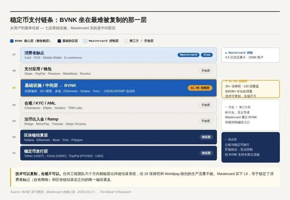 任何工程团队都能在六个月内搭出一套跨链结算系统。但 25 张牌照、130 个国家的监管关系、以及 Worldpay 和 Deel 愿意把生产流量交给你跑——这三样东西,没有捷径。Mastercard 收购的不是 BVNK 的代码,是这套受监管的分发能力。这才是稳定币基础设施真正稀缺的东西。