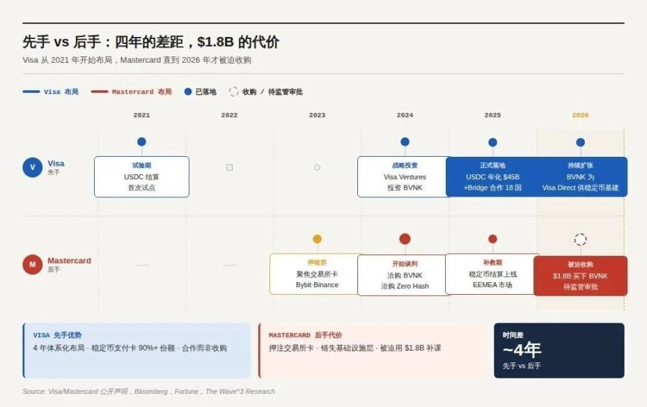 Visa 没有收购任何人——这本身就是一个判断。Visa Ventures 持有的 BVNK 股权随收购归属 Mastercard,战略伙伴变成竞争对手资产。但 Visa 的回应不是收购,是继续扩大合作网络:与 Stripe/Bridge 合作将稳定币 Visa 卡推向更多市场;与 Circle 深化 USDC 结算集成——Circle 本质上在做和 BVNK 同一件事,只是从发行方角度切入。