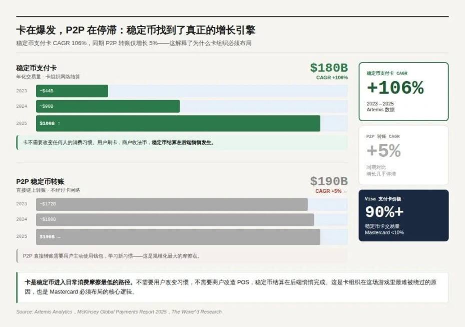 数字说明为什么这条路是对的。稳定币支付卡年化 $180 亿,CAGR 106%(Artemis);同期 P2P 稳定币转账只增长 5%。卡在爆发,P2P 在停滞。