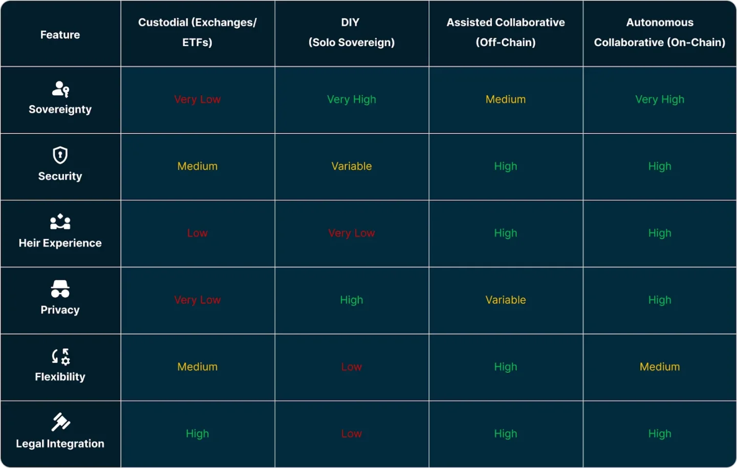 托管方案提供熟悉感,但代价是重新引入对机构的依赖。DIY 方案在技术过硬的情况下可以非常出色,但对所有者和继承人要求都更高。链下协作继承提升了可用性和灵活性。链上协作继承则增加了强健的长期后盾。