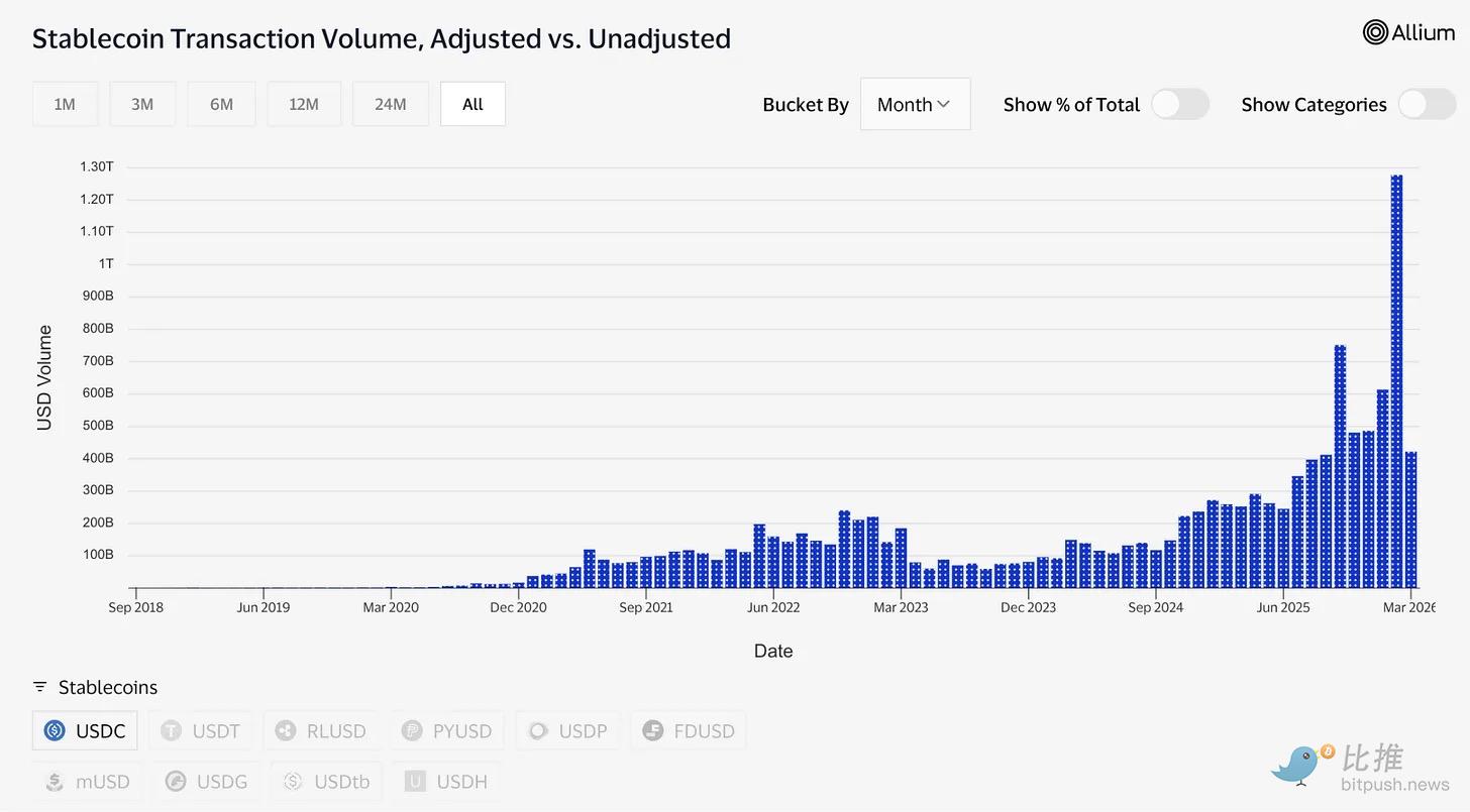 While the AI tier is smaller in terms of transaction volume, it's structurally interesting. Data released in March by Circle's Global Head of Marketing showed that AI agents completed 140 million payments totaling $43 million in the past nine months. 98.6% of these were settled in USDC, averaging $0.31 per transaction. There are currently over 400,000 AI agents with purchasing power. Although the dollar amounts are still small, the trend is undeniable. If AI agents need to make frequent, sub-tiered payments to each other for computing power, data access, and API calls, they need a tool that can settle instantly with near-zero sending costs. Circle recently launched Nanopayments specifically to address this need: supporting gas-free USDC transfers as low as $0.000001, with off-chain packaging and batch settlement. The testnet already supports 12 chains, including Arbitrum, Base, and Ethereum.