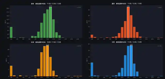· 夏季 12:00 的集中度最高,单个小时占全季的 27.6%。