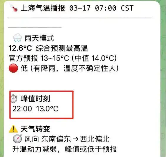 16 号凌晨,Telegram 频道推送了夜间模式的报告:明天是降温日。理由是当晚云况偏厚、季节和年内日序两个特征都指向降温方向。