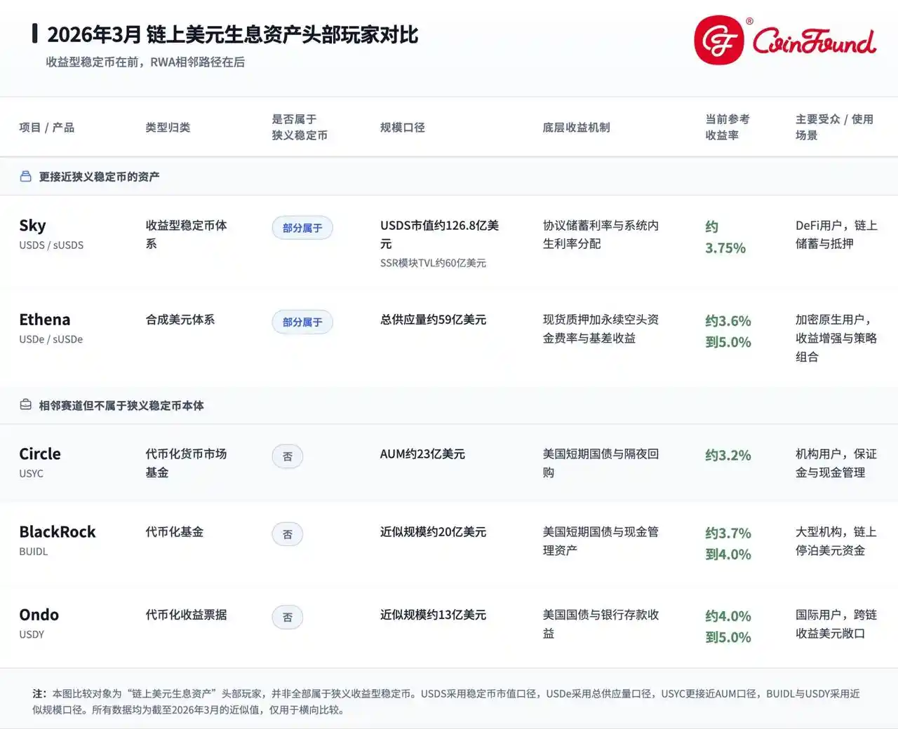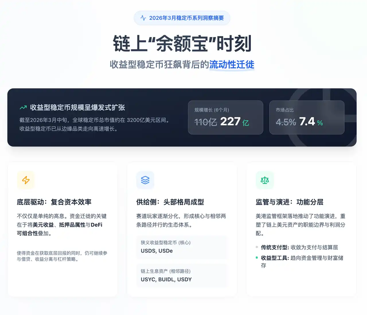 CoinFound 最新研究《链上“余额宝”时刻:收益型稳定币狂飙背后的流动性迁徙》指出,收益型稳定币已经从边缘品类走向高速增长。截至 2026 年 3 月中旬,全球稳定币总市值约在 3200 亿美元区间;收益型稳定币规模约 227 亿美元,较约六个月前的约 110 亿美元明显扩张,占整体稳定币市场的比重也由约 **4.5%**升至约 7.4%。