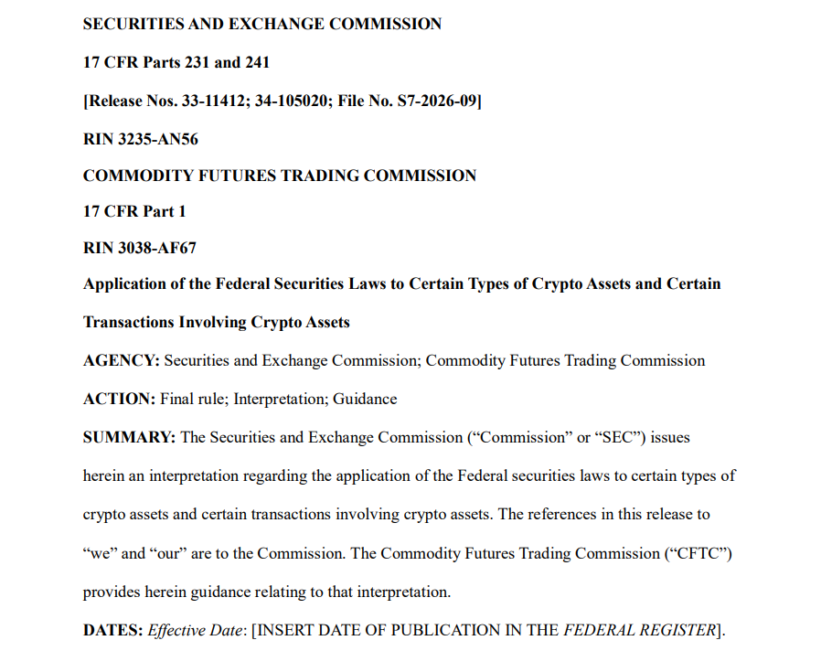 3月17日,美国证券交易委员会(SEC)与商品期货交易委员会(CFTC)联合发布了名为《Application of the Federal Securities Laws to Certain Types of Crypto Assets and CertainTransactions Involving Crypto Assets》(《联邦证券法对特定类型加密资产及相关交易的适用》)。这份长达68页的监管文件,系统性回答了加密资产分类、证券定性、典型交易合规性等核心问题,标志着美国加密资产监管从长期以来的"通过执法进行监管"(regulation by enforcement)模式,转向规则化、透明化的监管框架。本文Beosin将对报告的核心内容进行解读,帮助行业从业者深入了解美国最新监管政策与合规指引。